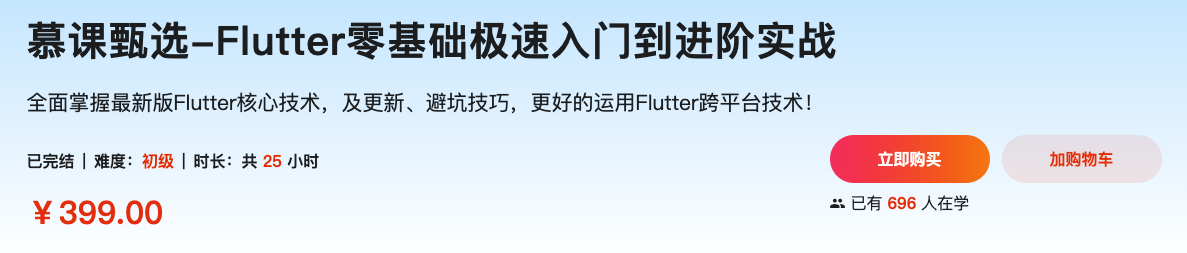 本门课程作为Flutter入门首选课,课程中结合了最新版的Flutter、Dart、主流插件技术进行企业级项目开发,并融入了大量Flutter版本更新问题的解决方案,以及与H5混合开发和通信、多屏适配等高频技能,课程中还将讲师近几年在一线开发中积累的大量开发、避坑等经验传授给大家,让各位小伙伴在实际开发中能更好的运用Flutter技术。